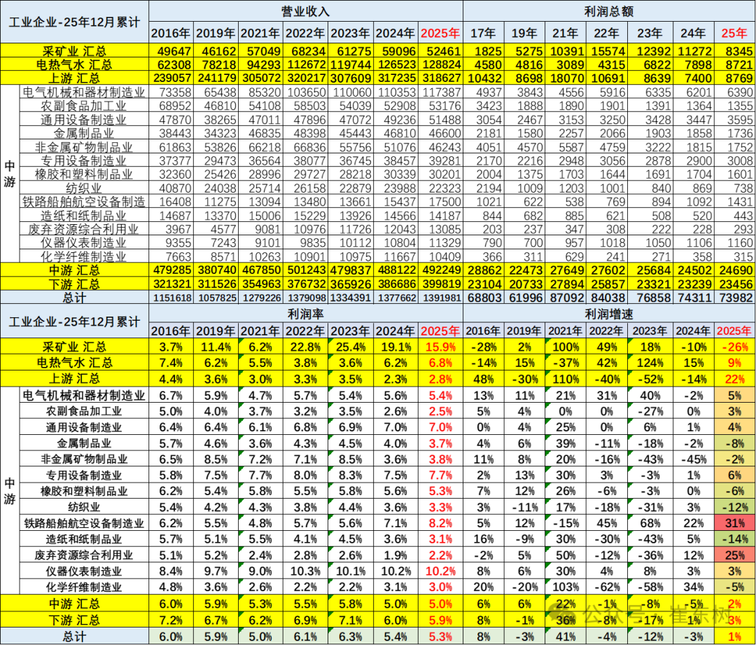 2025年上游行业的销售收入和利润都是出现高增长,尤其是利润率回升到2.8%。其中钢铁压延等为代表的销售利润率逐步企稳,从去年年初的巨额亏损到今年的盈利1098亿元,有所改善。化工原料和有色金属冶炼等行业利润还算较好。