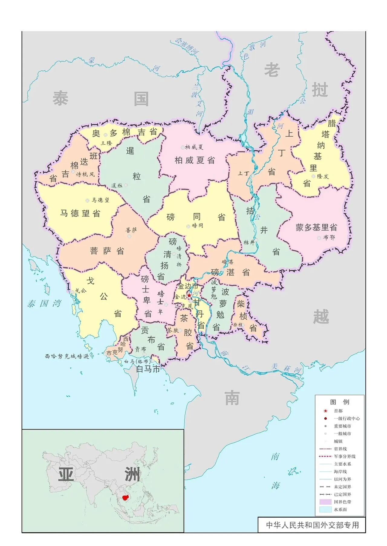 陆上有三个邻国,分别是西边的泰国,北边的老挝,和东南的越南,西南沿海则是泰国湾。