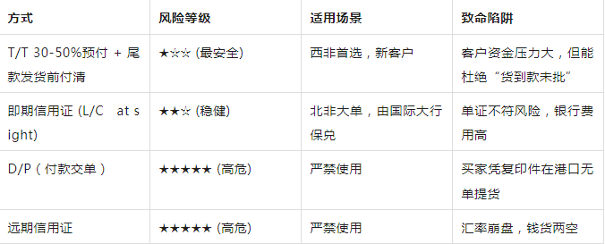 1)首选:国际大行保兑的即期L/C(北非大额订单标配)。