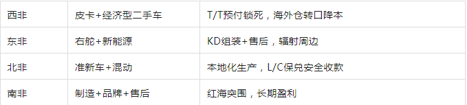 3)策略:在埃及、阿尔及利亚推进本地化生产(吉利、奇瑞等已落地);以摩洛哥为欧洲市场跳板,布局KD组装与售后体系。