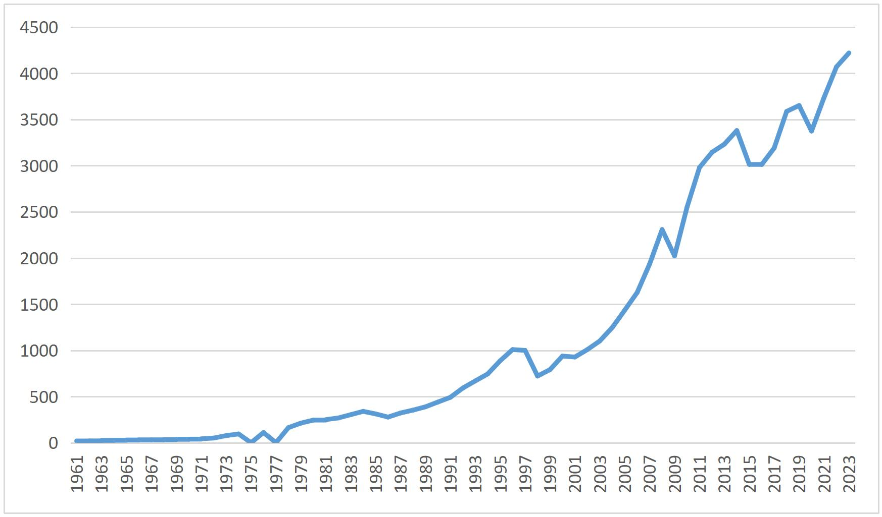 2023年,马来西亚对外货物贸易总额为5972亿美元,同比下降7.3%。其中,出口3235亿美元,同比下降8%;进口2737亿美元,同比下降 6.4%。