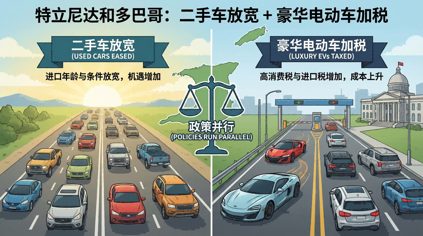 在最新公布的特立尼达和多巴哥(Trinidad and Tobago)2026财年预算案中, 汽车进出口相关政策出现两条同时推进的主线:一方面,为“让拥车更可负担”,政府将放宽外来二手车进口的允许车龄;另一方面,为应对外汇压力与税收流失,政府将收回对“高价豪华电动车”的免税待遇,并同步上调多项海关与口岸行政收费。多项措施定于2026年1月1日起生效。