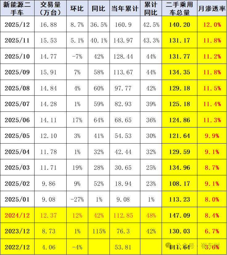 2025年12月,全国新能源二手车市场交易量16.9万台,环比增8.7%,同比增长36.5%,新能源渗透率12%。2025年1-12月,新能源二手车累计交易量161万台,同比增43%。