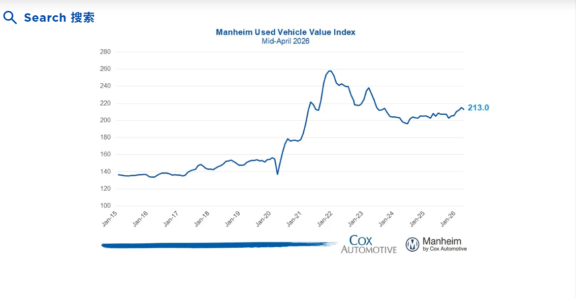 Manheim 指数4月18日数据:美国3月二手车价值指数同比涨6.2%,库存周期缩至40天内,供需两旺;欧洲二手电动车需求攀升(法国平台占比从6.5%升至12.7%),整体价格稳中有升。